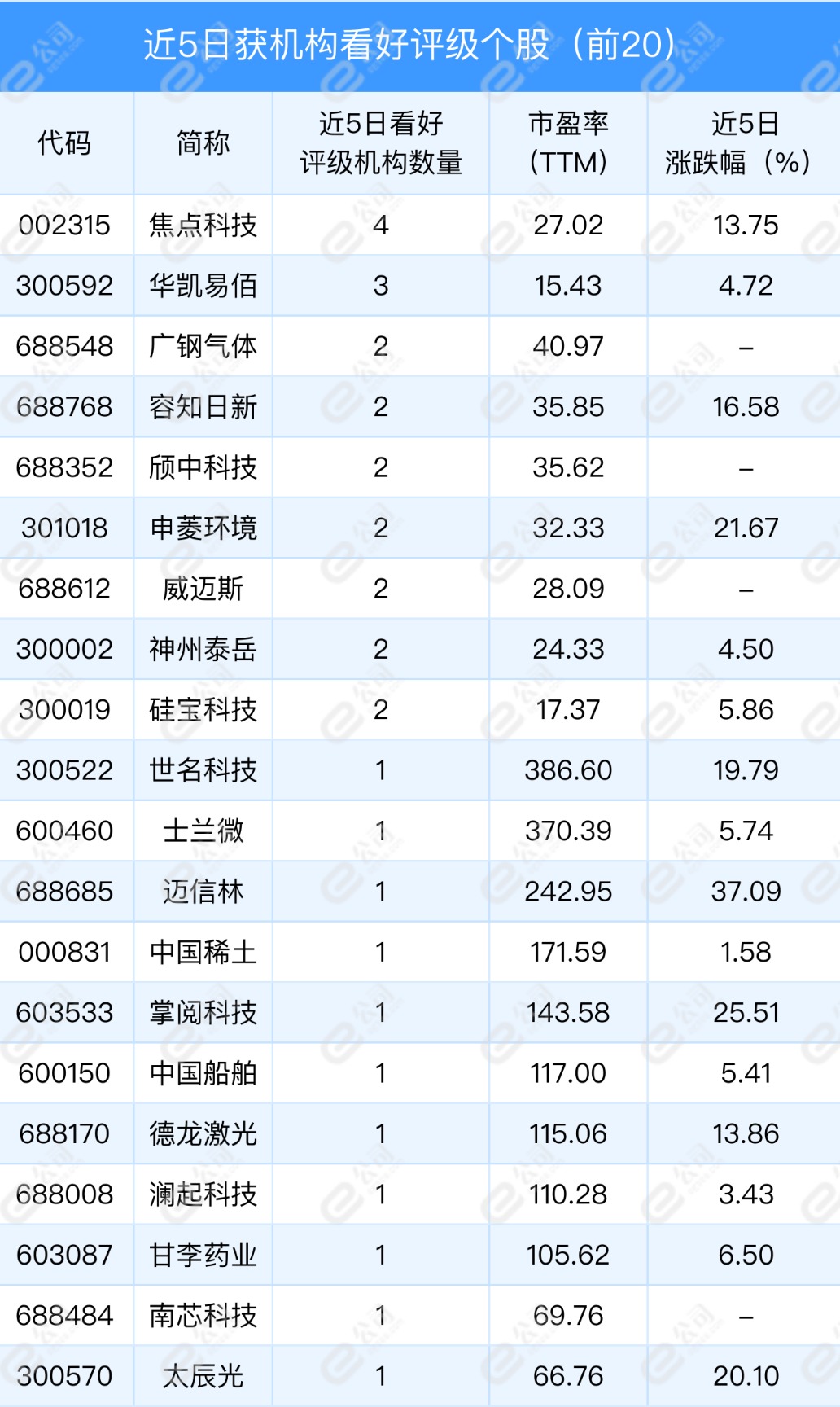 2只个股在近期被机构集中推荐,近5日内机构给予“买入”或“增持”等看好评级家数均逾3家及以上。具体来看,包括焦点科技、华凯易佰、广钢气体、容知日新、颀中科技等在内的9只个股期间机构看好评级家数均在2家以上。